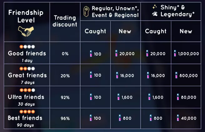 You can increase your friendship with other players by playing together. Sending gifts is the easiest way to check in daily and increase that total. But after a full week of friendship you only get a 20% trading price discount, bringing that 20,000 down to 16,000 (still 160 Pokémon’s worth of stardust!) The big discounts come in after a full month of daily play with someone, cutting all prices by 92%. That’s nearly the best it can be, cutting 16,000 down to just 1,600. And after 90 days of co-op you get a 96% discount bringing the high price to simply 800 stardust.