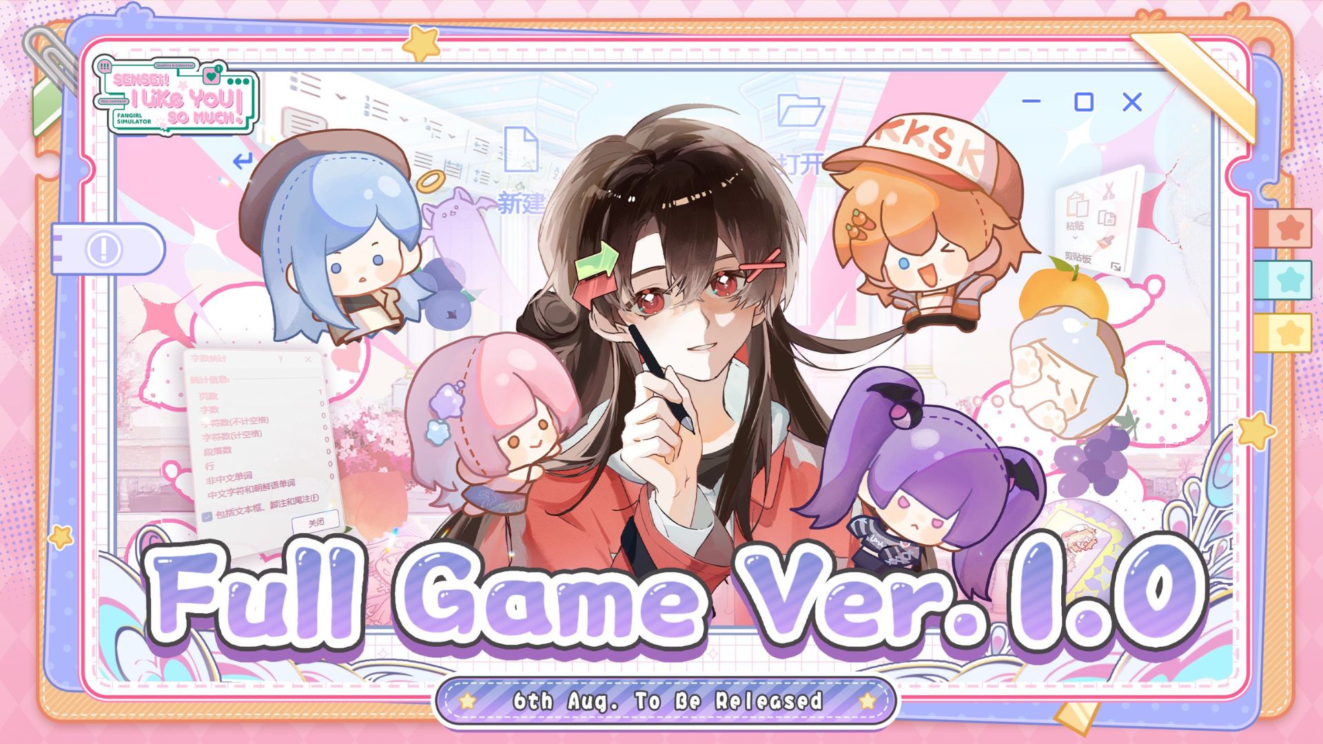 Sensei! I Like You So Much! is a role-playing simulator. Players are a fanfiction (fanfic) writer whose alias has been outed by a fellow classmate. Bolstered by the classmate’s confidence in their writing, players strive forward with posting their fanfiction online and taking a larger part in the fandom community. With 100 days until the big convention, players must write fanfiction and gain a fan base to ensure a successful convention stand.