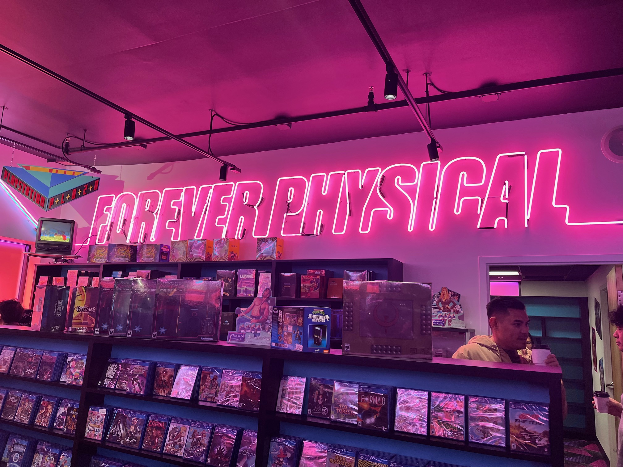 I’ve never been to the retail store before, and let me tell you, it was a VIBE. With lots of pink neon and retro-style carpeting, I felt right at home. Even the faint smell of popcorn made me yearn for the Blockbuster days. The retail store is modest in size and primarily organized by platform, and the games were in alphabetical order. To the left were trading cards and Press Run books. Then come the video games: the Nintendo Switch titles, followed by PlayStation 4 and 5, and Xbox toward the center of the store.